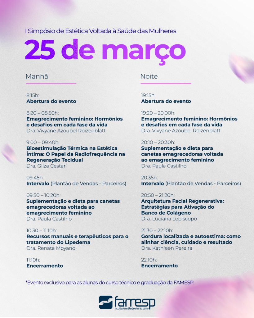 Voltado para as estudantes do curso de Estética da FAMESP, o evento tem como propósito expandir horizontes, incentivar o pensamento crítico e promover a troca de experiências com profissionais e colegas da área. Ao longo do dia, você terá acesso a conteúdos relevantes, tendências atuais e discussões fundamentais para a sua formação, preparando você para os desafios e oportunidades do mercado.